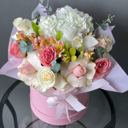 Корзина с лилией, белыми розами, альстромерией и декоративной зеленью «Весенний сад»