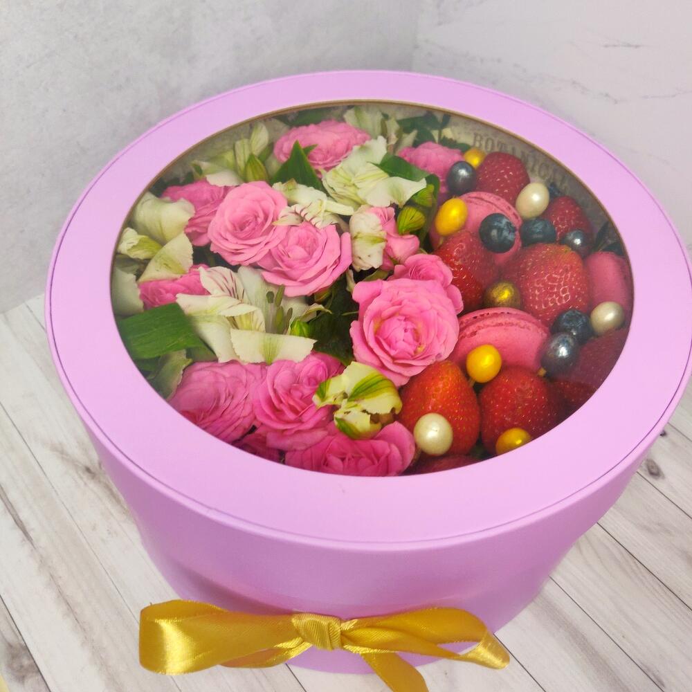 Альстромерия – 3 шт.Клубника – 300 гр.Коробка шляпная – 1 шт.Фисташка – 3 шт.орехи в глазури – 10 шт.кустовые розы – 10 шт.макааруни – 4 шт.