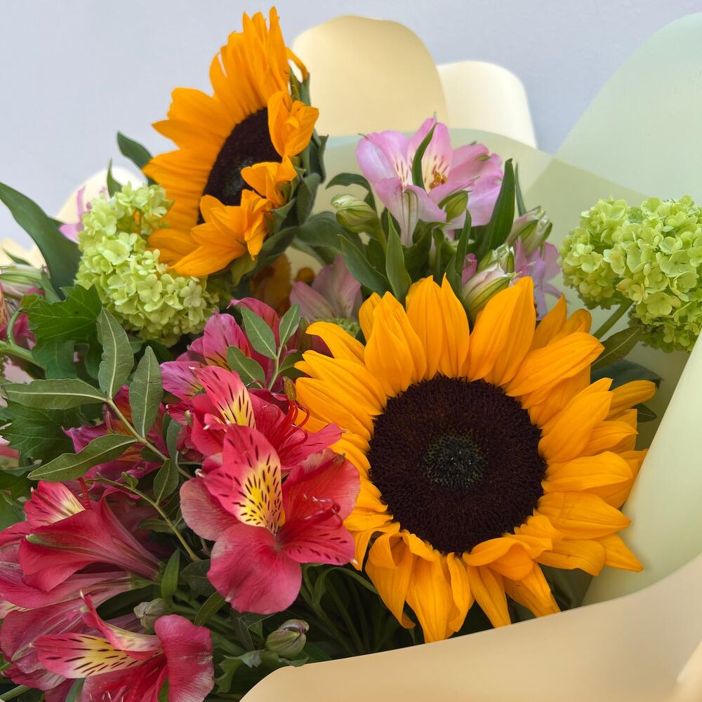 Подсолнух – 2 шт.Альстромерия – 6 шт.Вибурнум – 2 шт.Пленка дизайнерская – 1 шт.Лента атласная – 1 шт.