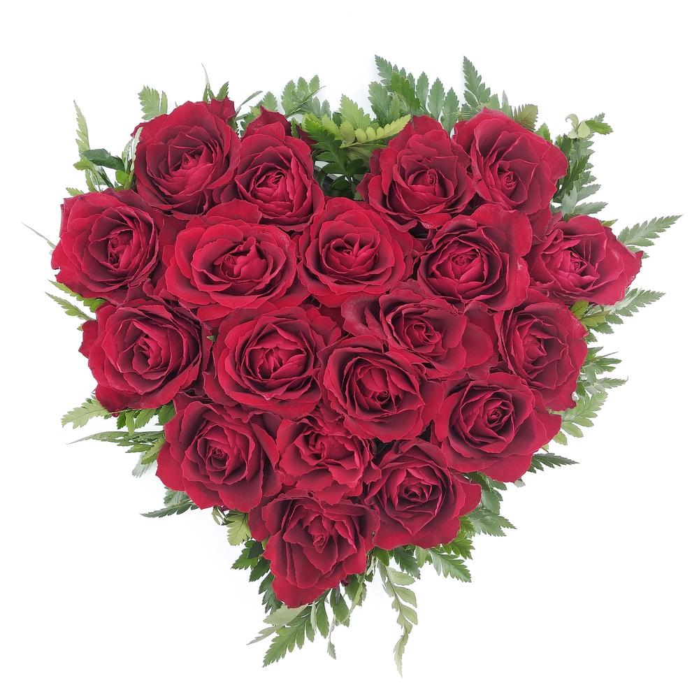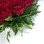 Composition in the form of heart from the single-headed red roses framed with fern. It is not necessary for the vase, because the roses are in floral oasis and get the necessary water out of it