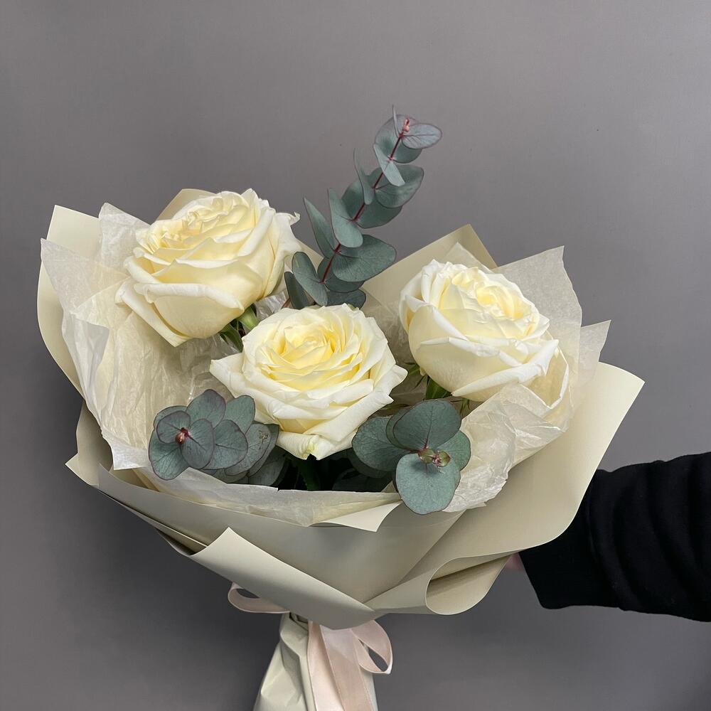 Эвкалипт – 2 шт.Лента атласная – 1 шт.Упаковка дизайнерская – 2 шт.розы кендилайт – 3 шт.