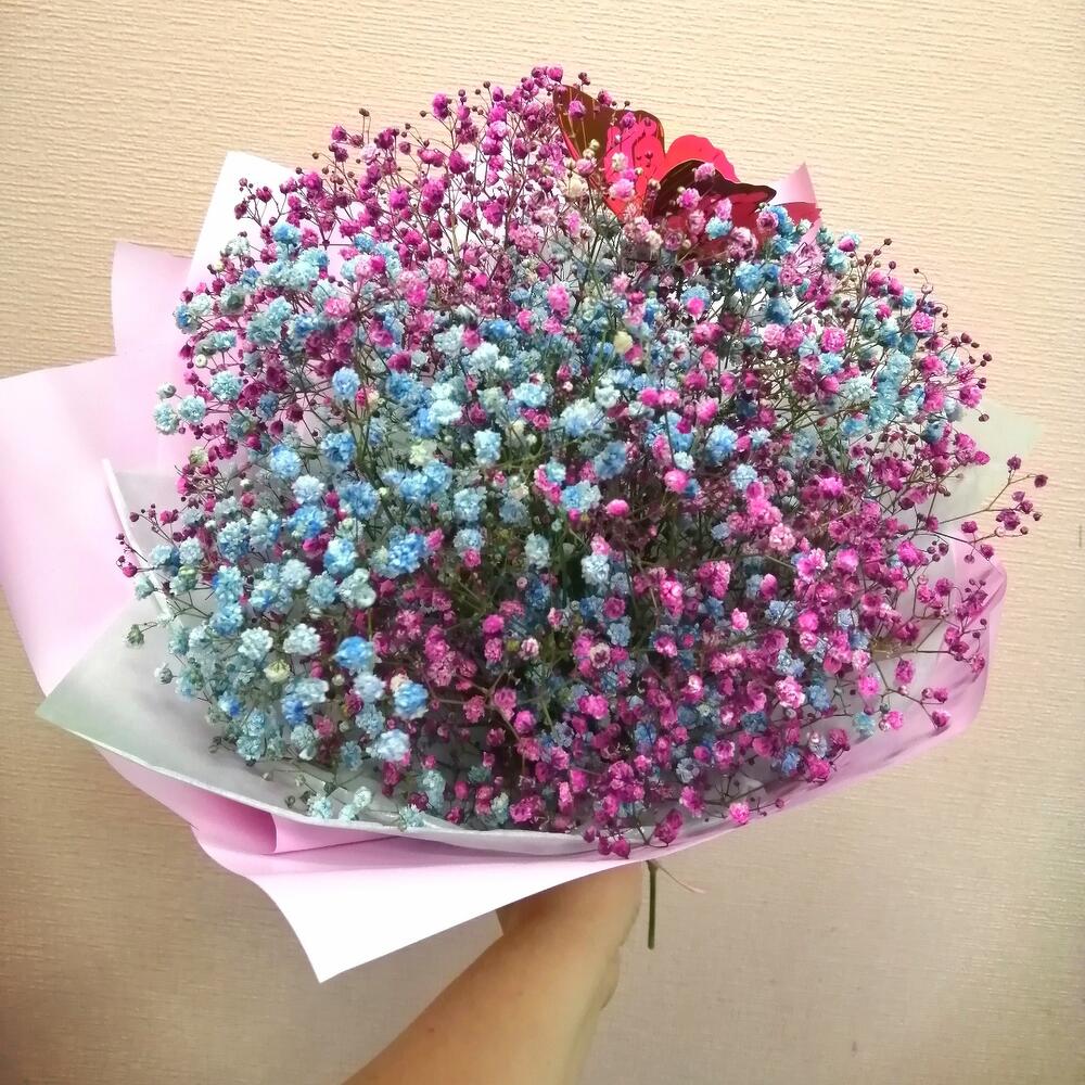 гипсофила радужная – 5 шт.Бабочка декоративная – 1 шт.Упаковка дизайнерская – 1 шт.Лента – 1 шт.