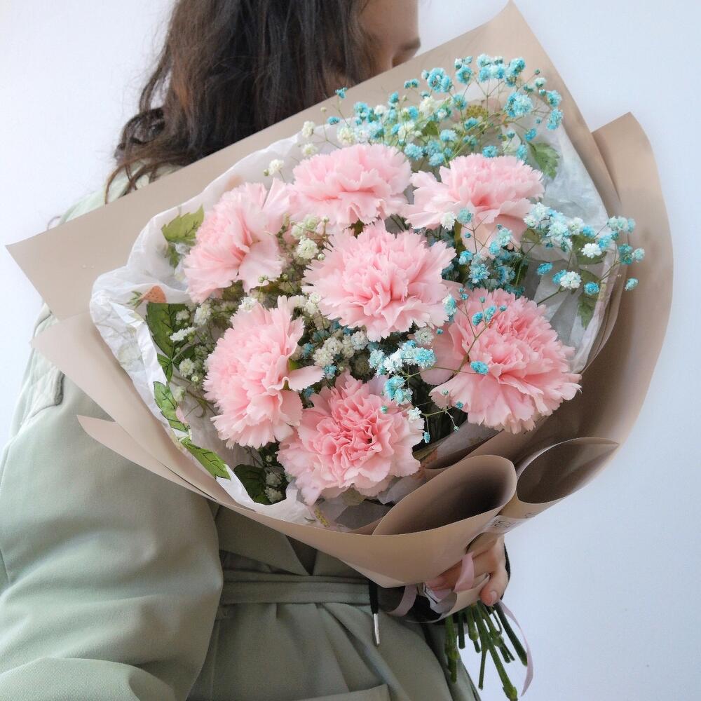 гипсофила цветная – 11 шт.Упаковка корейская пленка – 2 шт.Тишью – 2 шт.Лента атласная – 1 шт.Упаковка транспортировочная пленка – 1 шт.инструкция по уходу за цветами – 1 шт.