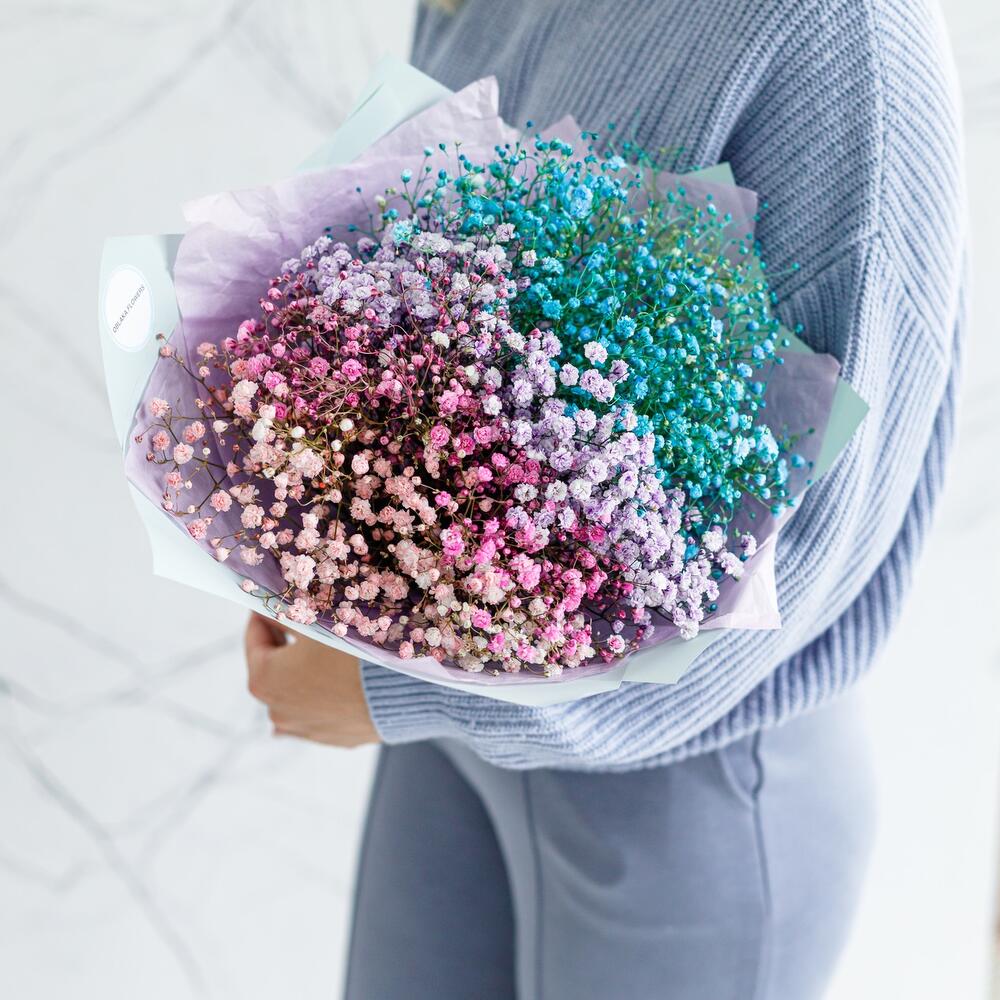 Гипсофила – 7 шт.Упаковка корейская – 2 шт.Лента атласная – 1 шт.