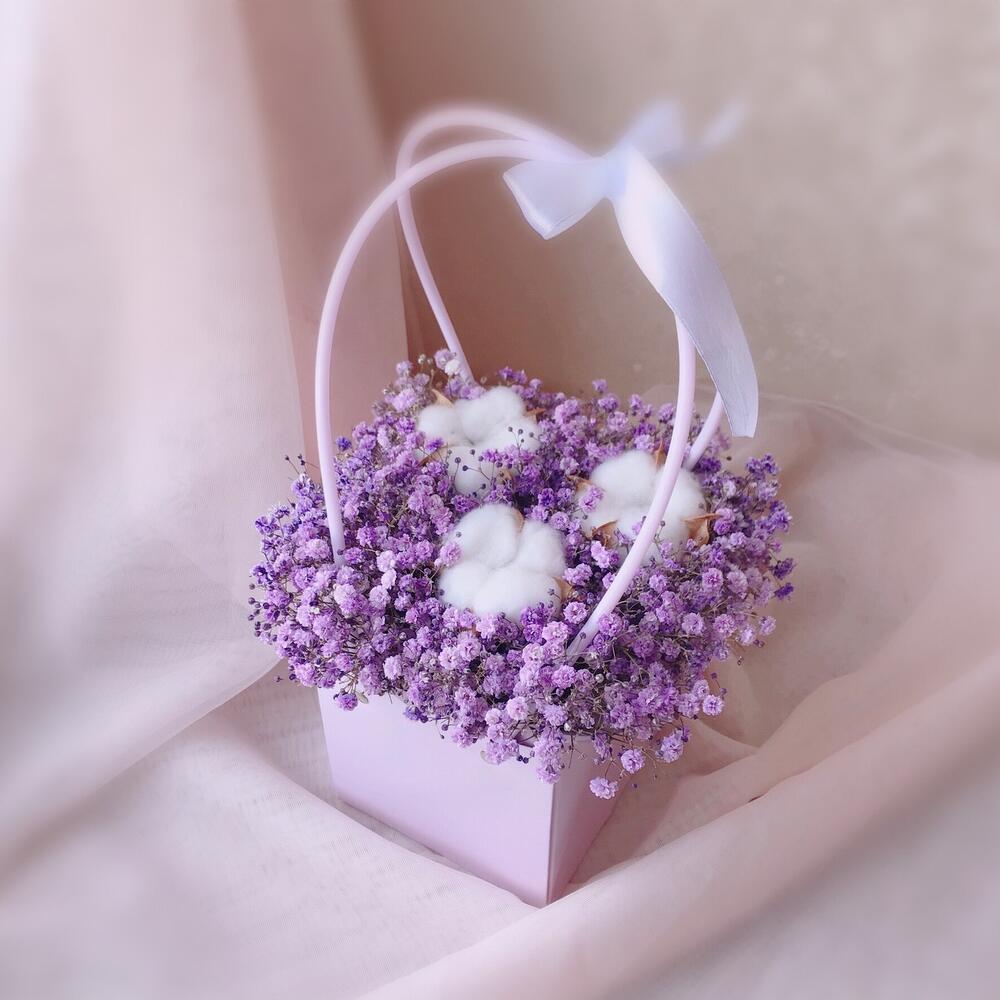 Хлопок – 3 шт.Лента атласная – 1 шт.Сумочка – 1 шт.Флористическая губка – 1 шт.Гипсофила фиолетовая – 3 шт.