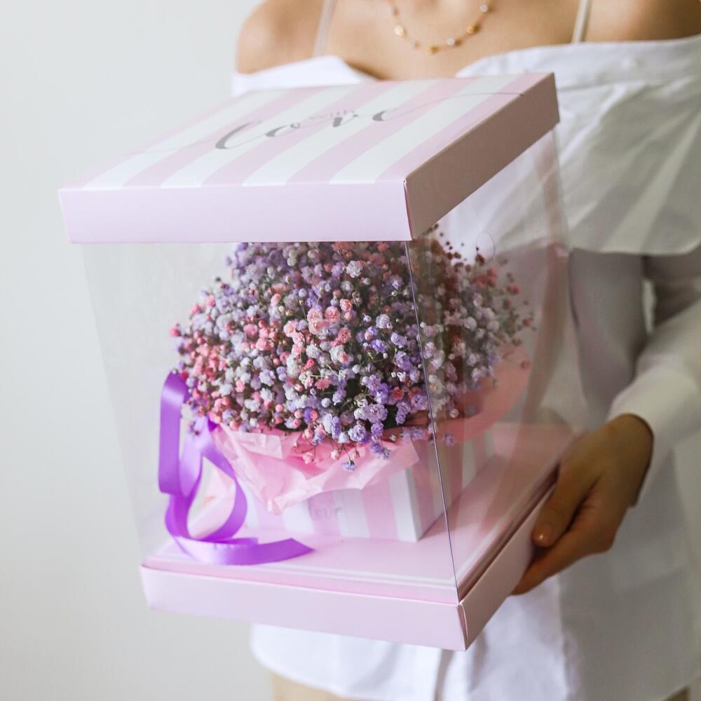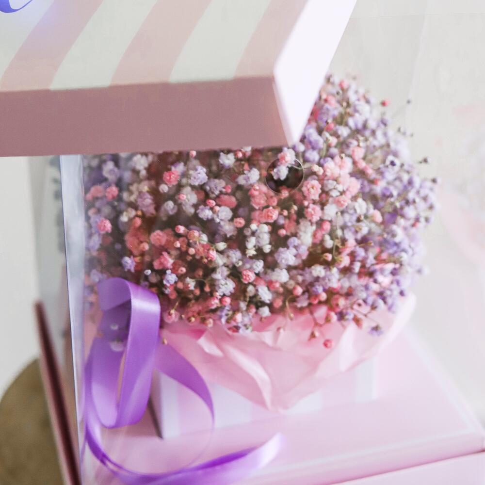 “Сиреневый туман” – композиция из гипсофилы в шляпной коробке