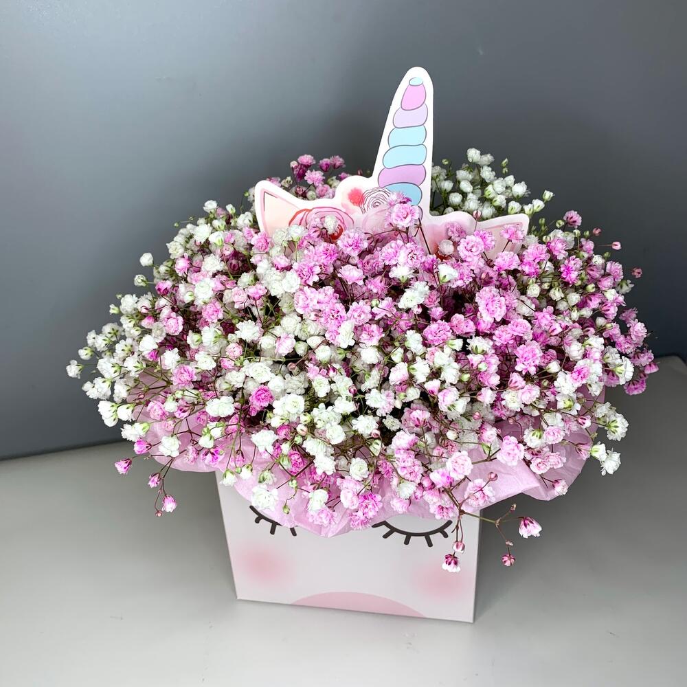 гипсофила радужная – 5 шт.Коробка – 1 шт.Топпер – 1 шт.Оазис флористический – 1 шт.Пленка прозрачная – 1 шт.Лента атласная – 1 шт.