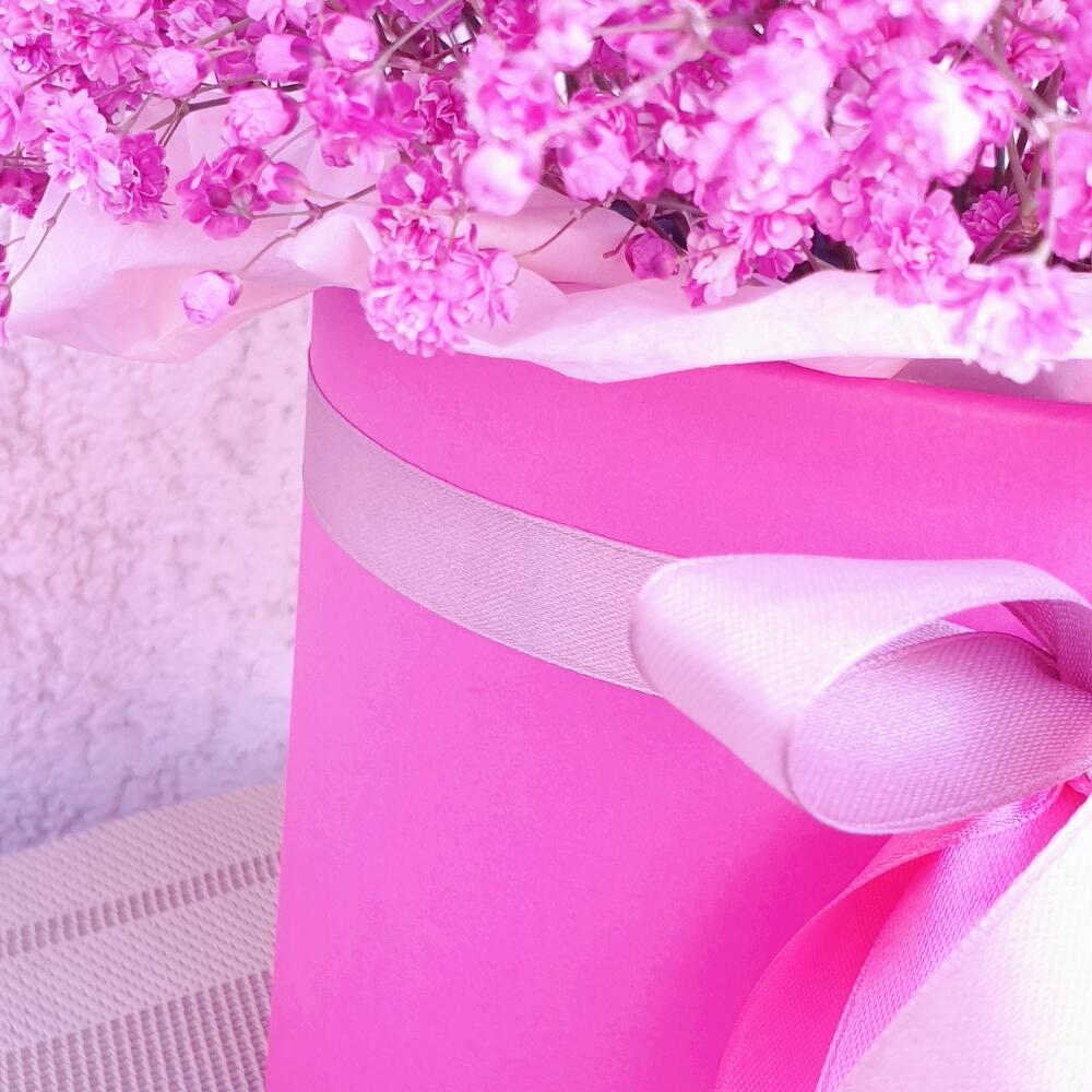 Лента атласная – 2 шт.Коробка шляпная – 1 шт.Открыточка с вашими пожеланиями – 1 шт.Оазис флористический – 1 шт.гипсофила радужная – 9 шт.тишью упаковка розовая – 1 шт.