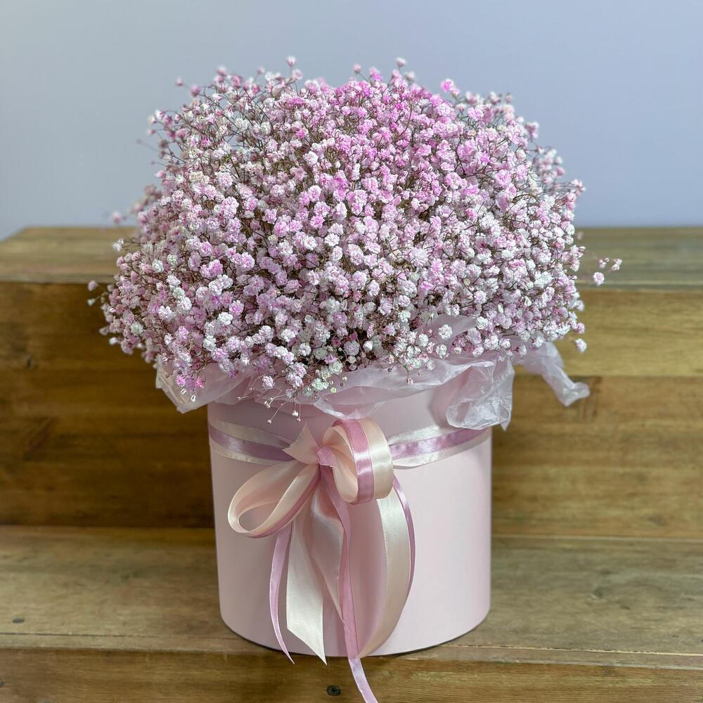 Гипсофила – 9 шт.Лента – 2 шт.Тишью – 1 шт.Коробка шляпная – 1 шт.Оазис флористический – 1 шт.
