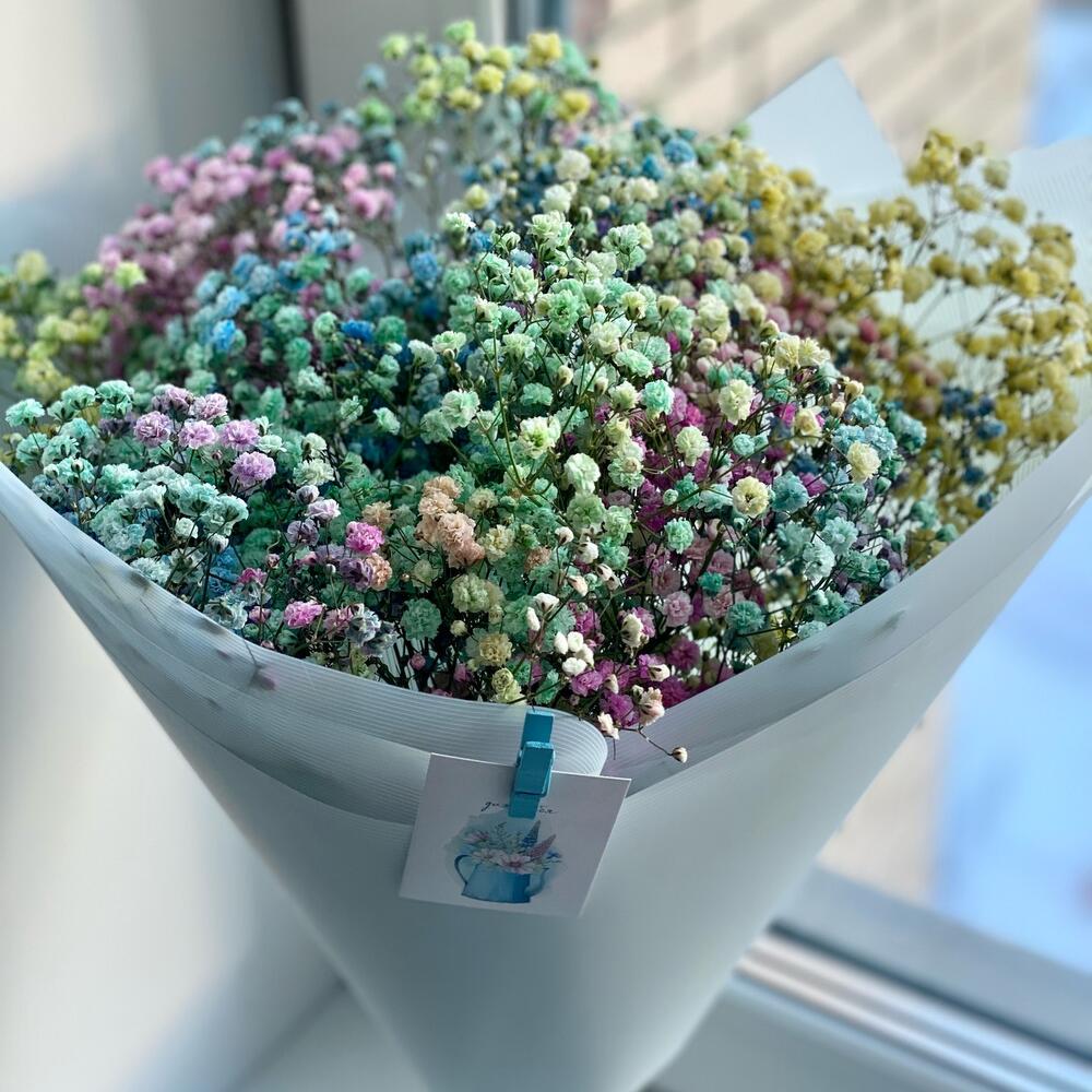 Лента атласная – 1 шт.Упаковка дизайнерская – 7 шт.Гипсофила крашеная – 7 шт.