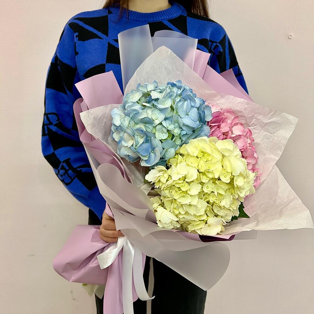 Гортензия – 3 шт.Лента атласная – 1 шт.Упаковка дизайнерская – 3 шт.