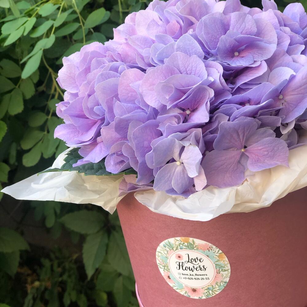 Гортензия – 1 шт.Коробка шляпная – 1 шт.Оазис – 1 шт.Упаковка тишью – 1 шт.