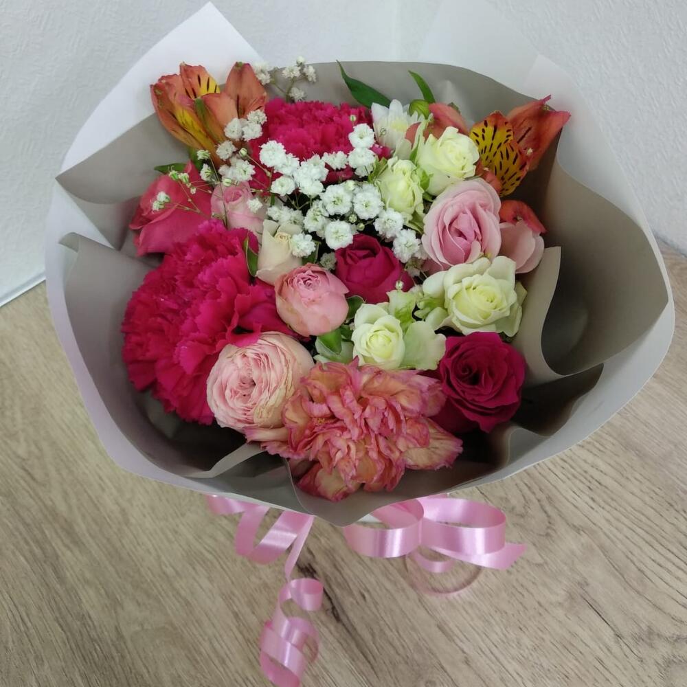 Альстромерия – 1 шт.Роза кустовая – 1 шт.Диантус – 3 шт.Роза голландия – 3 шт.Упаковка дизайнерская – 1 шт.Оазис флористический – 1 шт.роза кения – 2 шт.