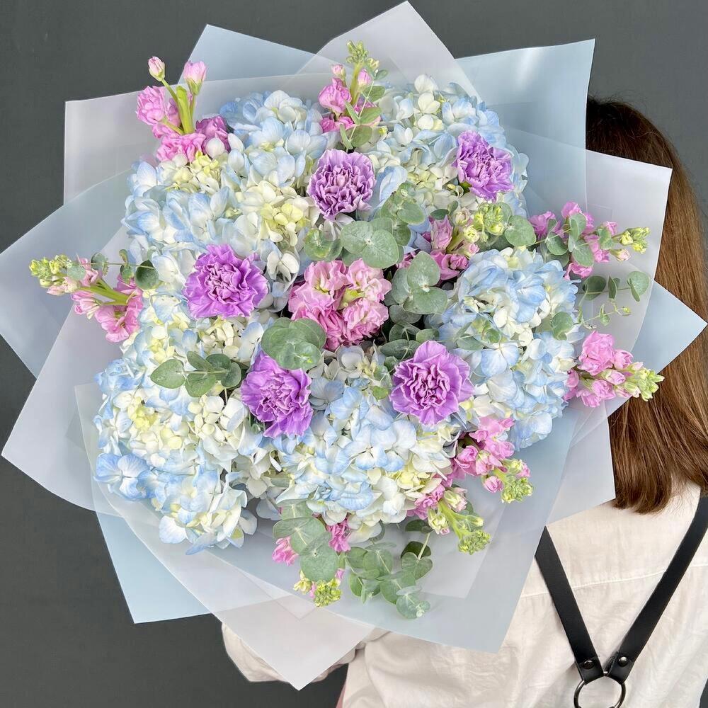 Авторский букет голубая Гортензия и ароматная Маттиола