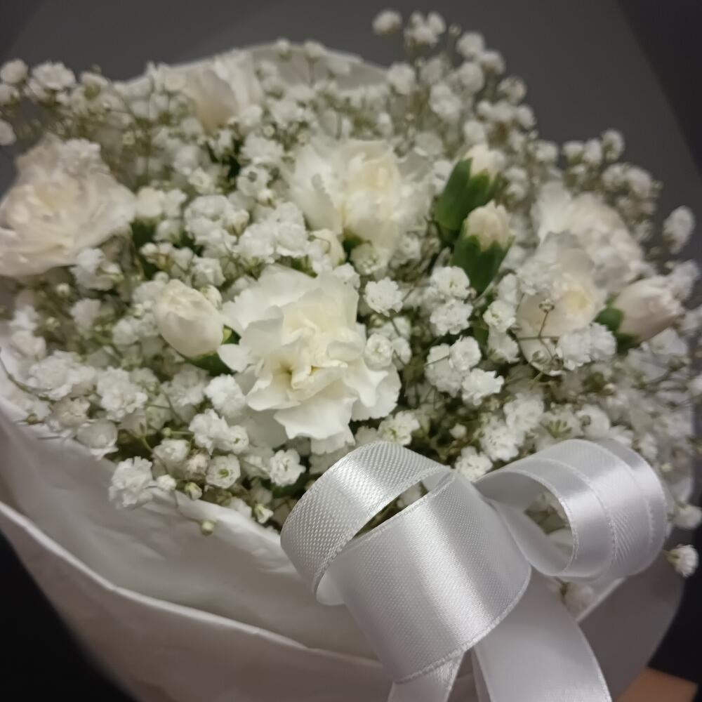 Гипсофила – 3 шт.Лента атласная – 2 шт.Гвоздика кустовая – 4 шт.Упаковка дизайнерская – 1 шт.