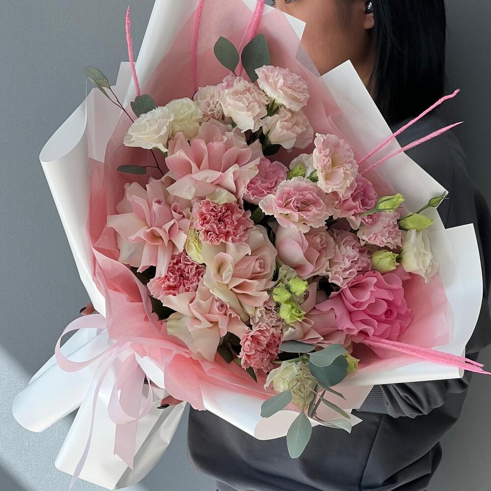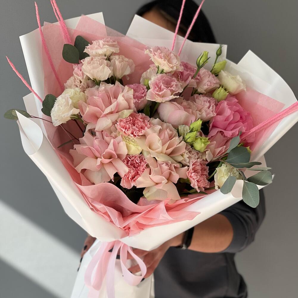 Гвоздики, Лизиантусы, Розы, Тюльпаны