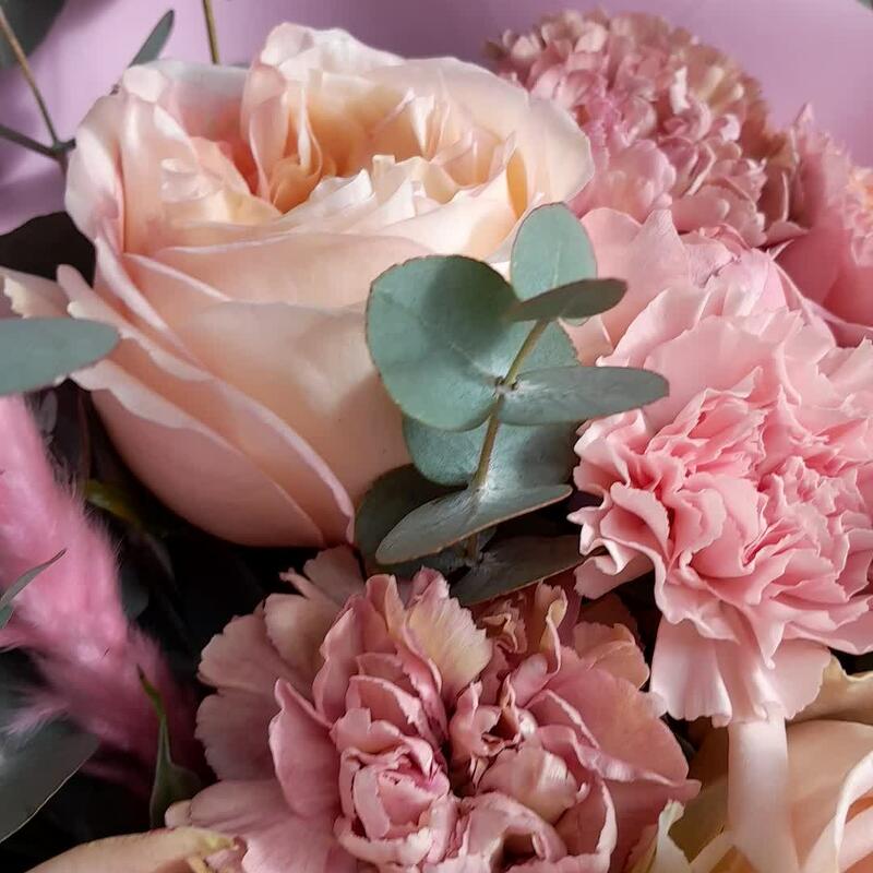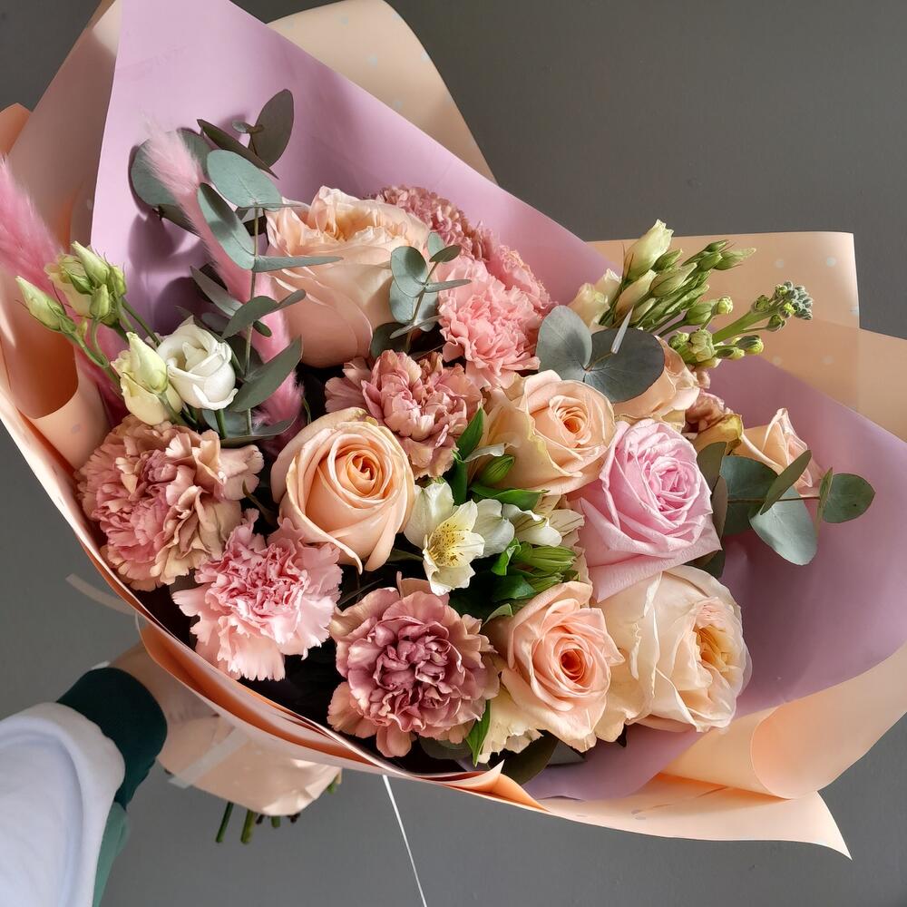 Роза – 8 шт.Диантус – 8 шт.Эустома – 2 шт.Маттиола – 1 шт.Альстромерия – 2 шт.Эвкалипт – 3 шт.Упаковка дизайнерская – 4 шт.Лента атласная – 2 шт.