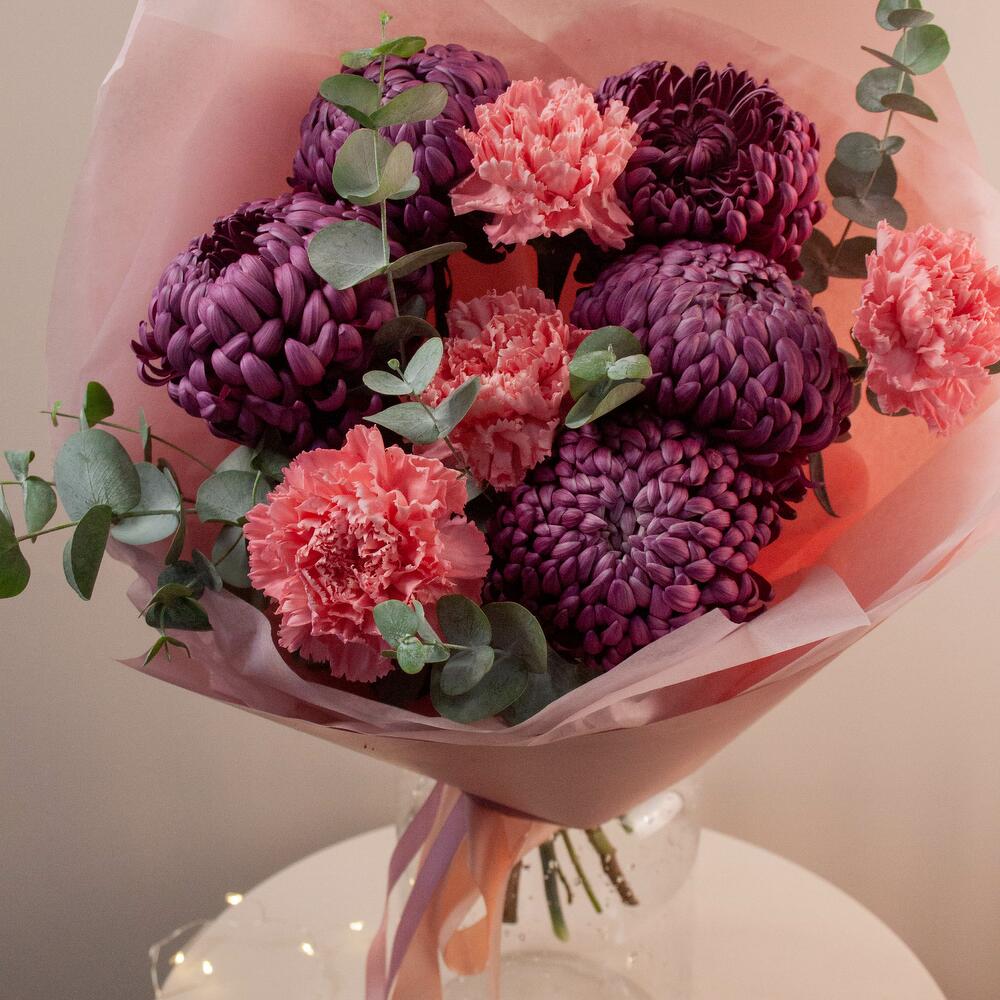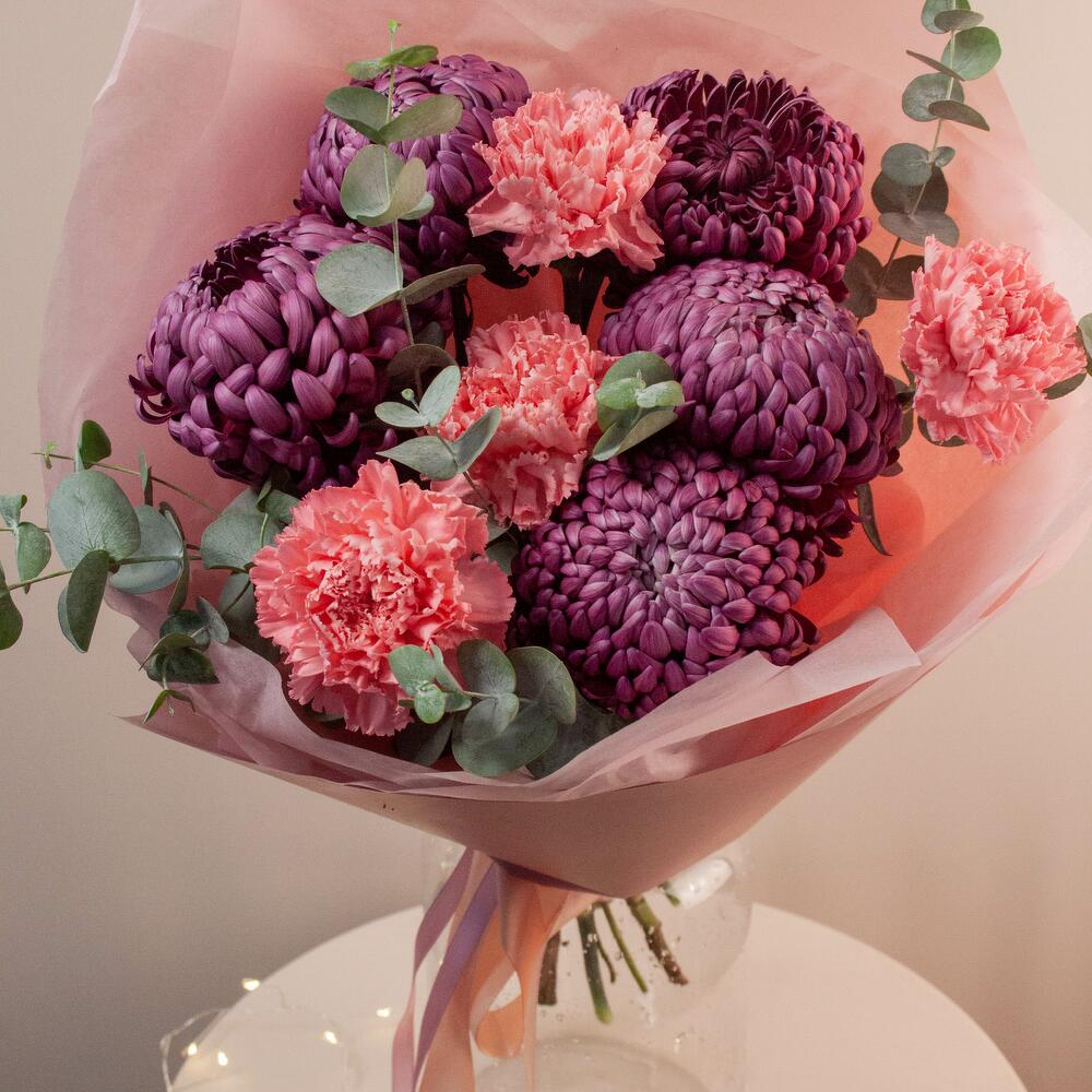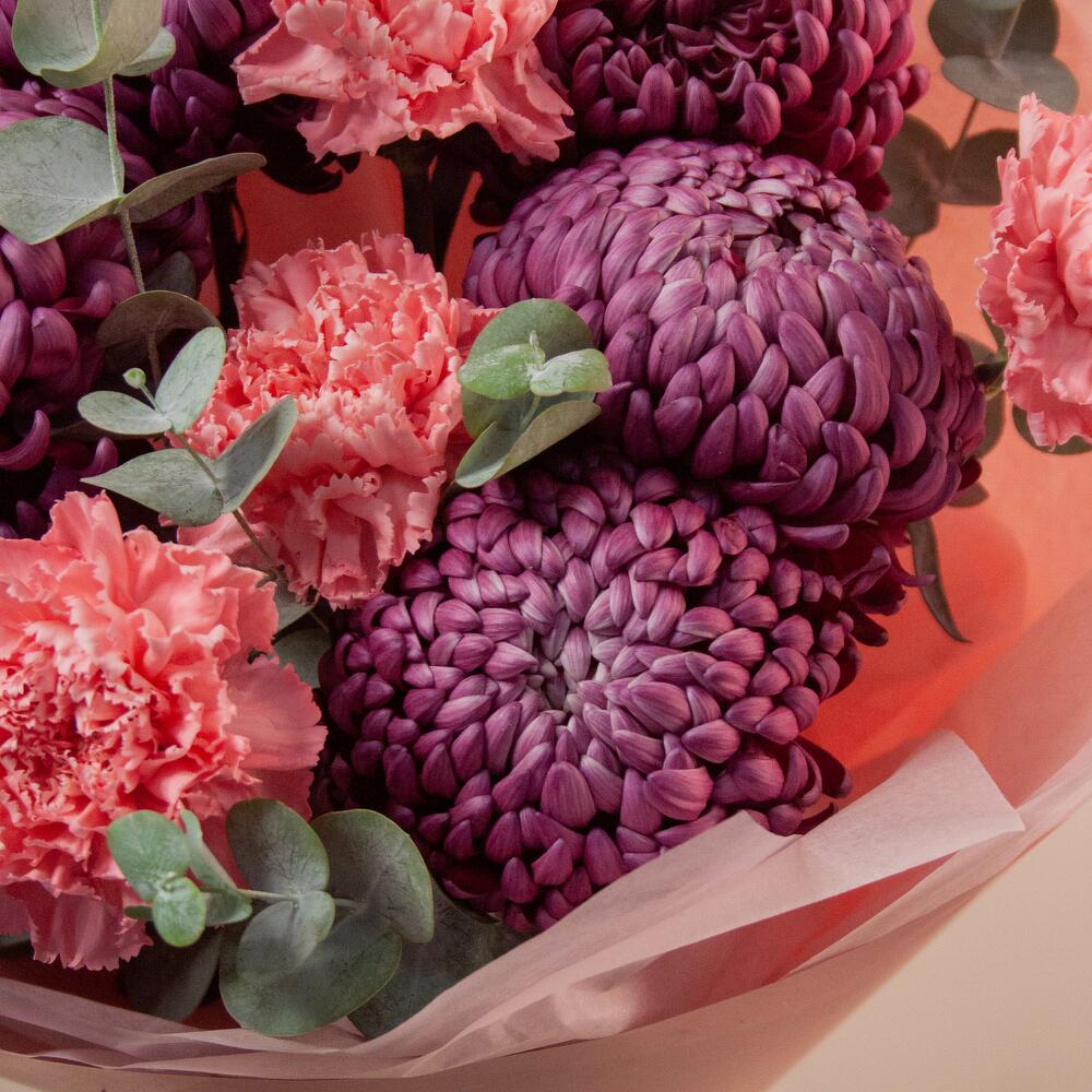 Альстромерии, Гвоздики, Кустовые розы, Лизиантусы, Розы, Хризантемы
