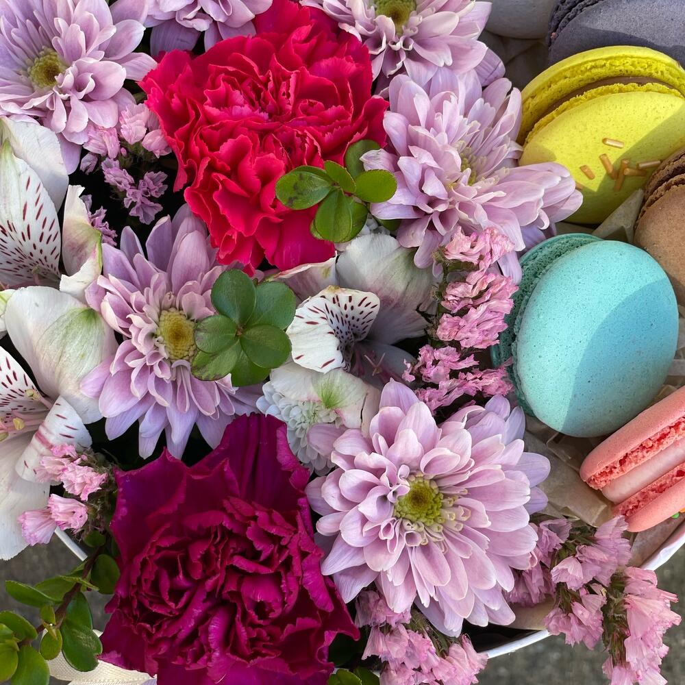 Альстромерия – 1 шт.Статица – 1 шт.Хризантема кустовая – 1 шт.Гвоздика – 2 шт.Тишью – 2 шт.Коробка шляпная – 1 шт.Самшит – 1 шт.Оазис флористический – 1 шт.макарон (пирожное) – 6 шт.