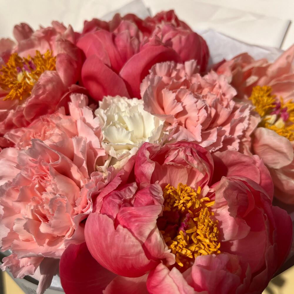 Гвоздика – 6 шт.Пион коралл шарм – 5 шт.Дизайнерская упаковка – 1 шт.