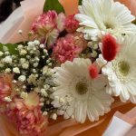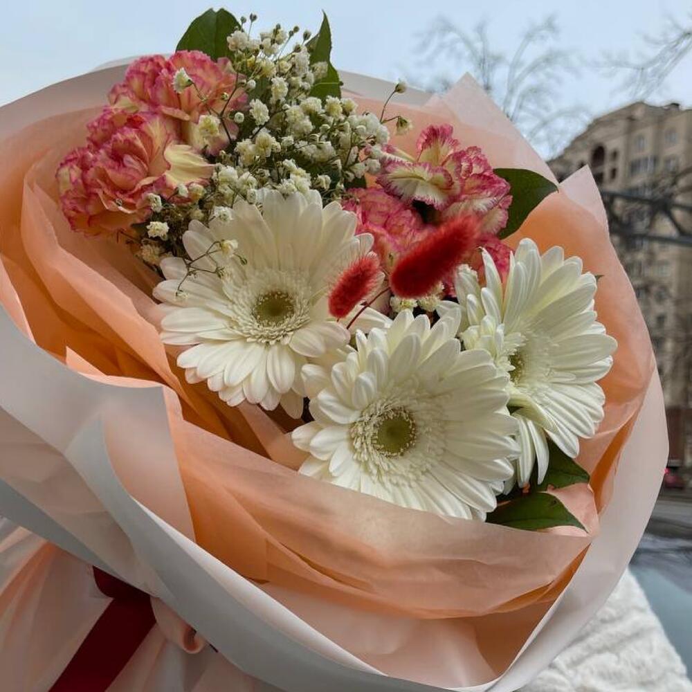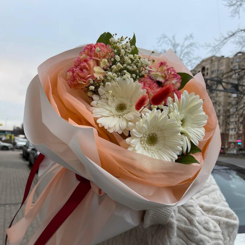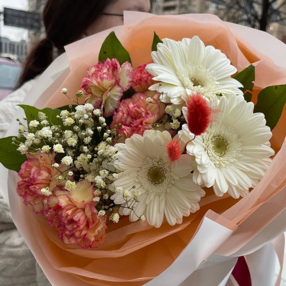 гербера белая мини – 3 шт.Гвоздика сортовая – 5 шт.Гипсофила – 1 шт.Салал пучок – 1 шт.Лагурус – 3 шт.Тишью – 4 шт.Пленка матовая – 6 шт.