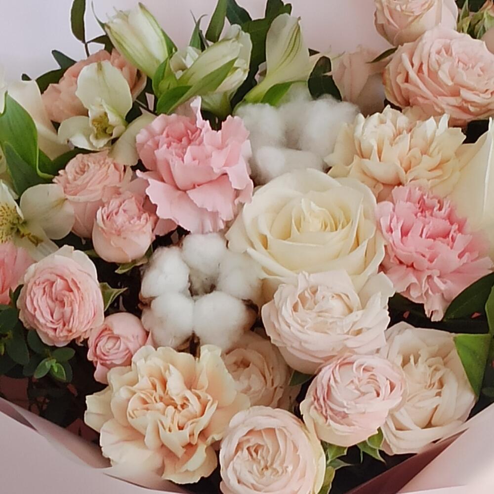 Альстромерии, Гвоздики, Кустовые розы, Лизиантусы, Розы, Хризантемы