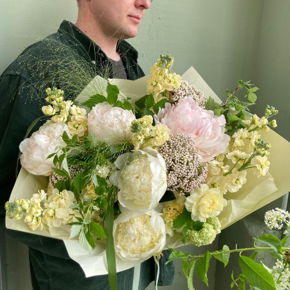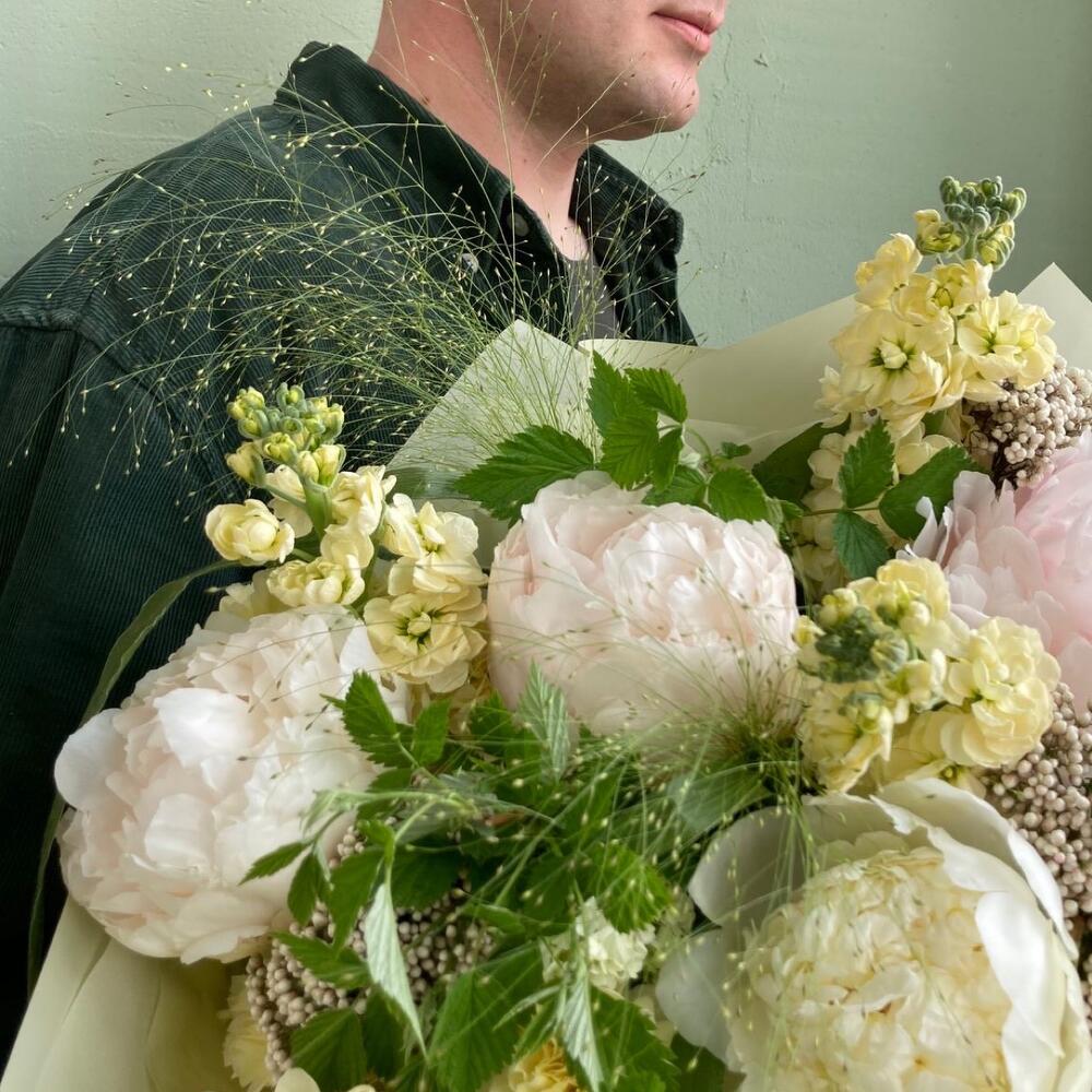 Пион – 5 шт.Паникум – 3 шт.Маттиола – 6 шт.Гвоздика – 3 шт.Озотамнус – 3 шт.Ветки малины – 3 шт.Упаковка – 1 шт.