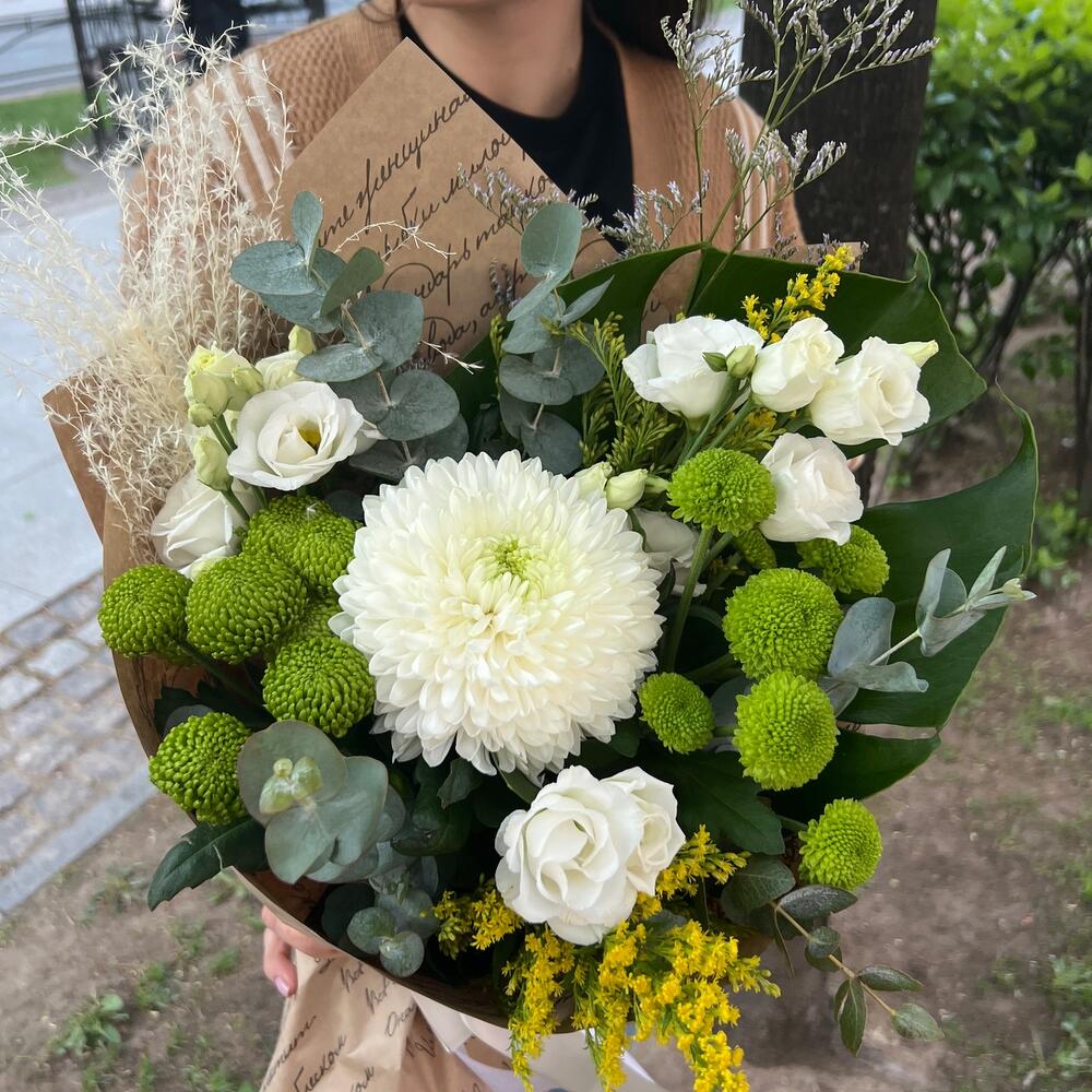 Хризантема – 1 шт.Хризантема кустовая – 2 шт.Солидаго – 2 шт.Лизиантус – 2 шт.Эвкалипт – 1 шт.Зелень – 1 шт.Лимониум – 1 шт.Сухоцвет – 1 шт.Упаковка дизайнерская – 1 шт.