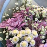 Хризантема кустовая – 5 шт.Хризантема сталион – 3 шт.гипсофила радужная – 2 шт.Рускус – 2 шт.Упаковка дизайнерская – 2 шт.