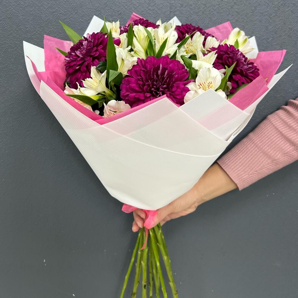 Альстромерия – 6 шт.Лента атласная – 2 шт.Тишью – 2 шт.Пленка матовая – 2 шт.ламира хризантема – 5 шт.