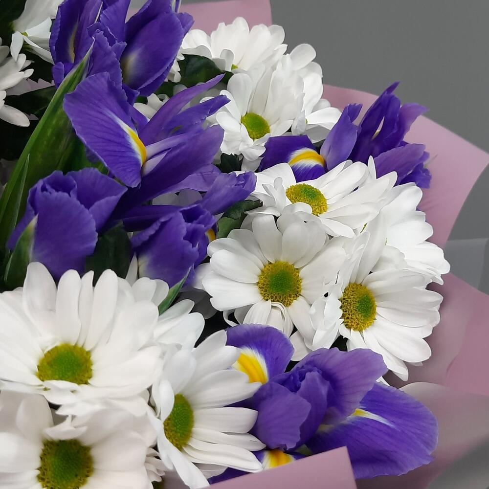 Хризантема кустовая ромашковая – 5 шт.Ирис Blue Magic – 11 шт.Упаковка дизайнерская – 2 шт.