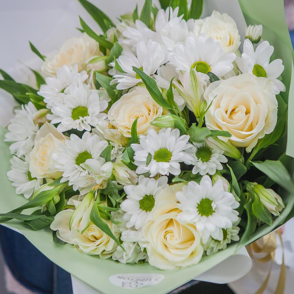 белые розы – 7 шт.белая хризантема – 3 шт.Альстромерия белая – 9 шт.