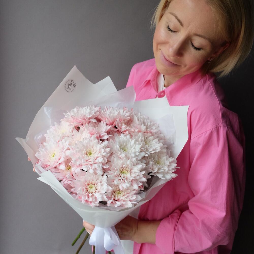 Хризантема кустовая – 5 шт.Тишью – 1 шт.Упаковка дизайнерская – 1 шт.Открыточка с вашими пожеланиями – 1 шт.