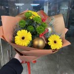 Гербера – 3 шт. Ель – 1 шт. Упаковка дизайнерская – 1 шт. хризантемы кустовые – 1 шт. инрушки новогодние – 3 шт.