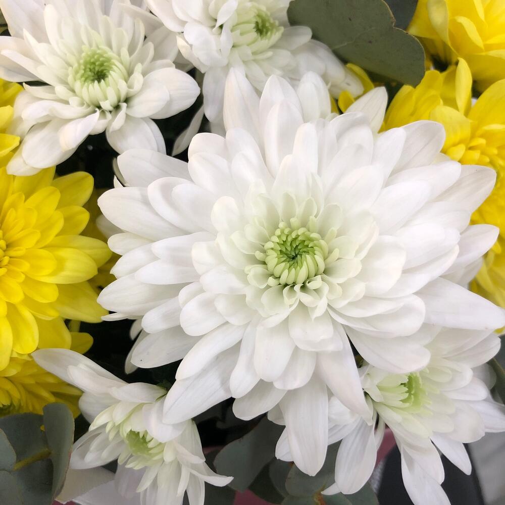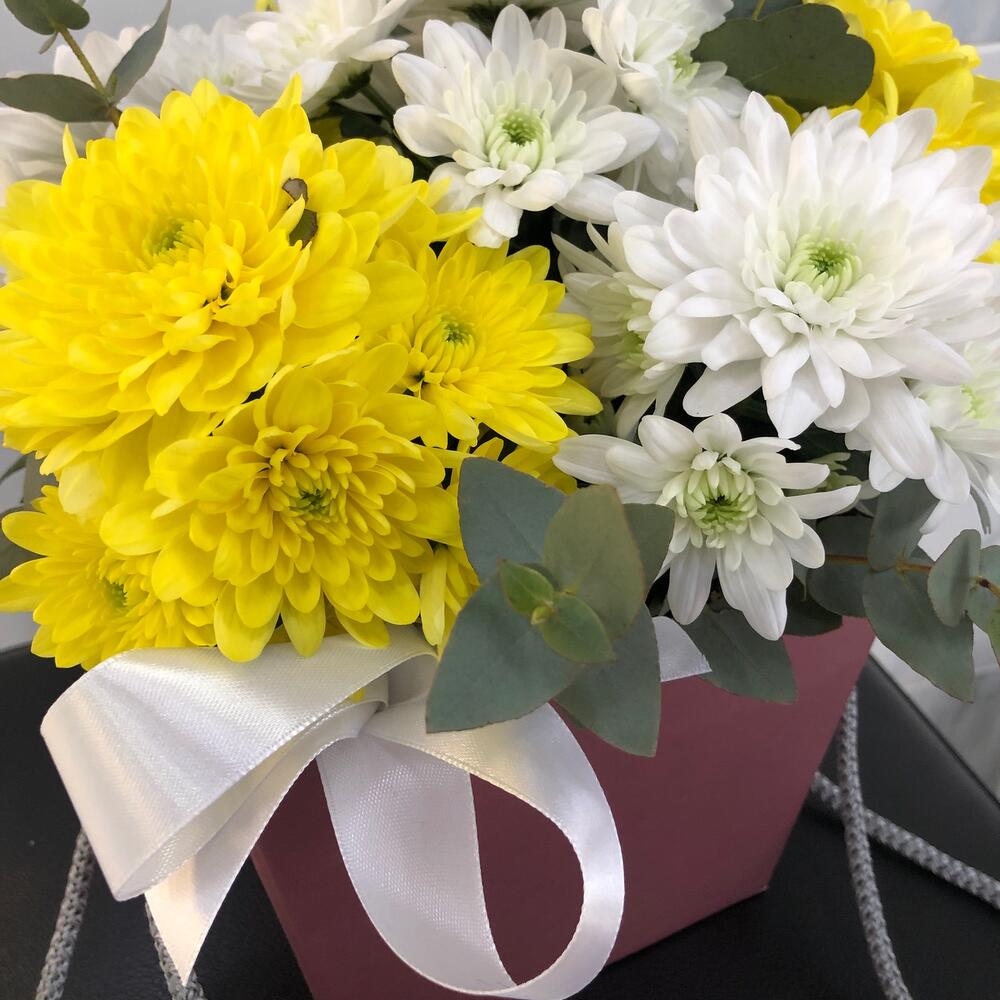 Хризантема кустовая – 7 шт.Эвкалипт Микс – 1 шт.Оазис флористический – 1 шт.Сумочка – 1 шт.