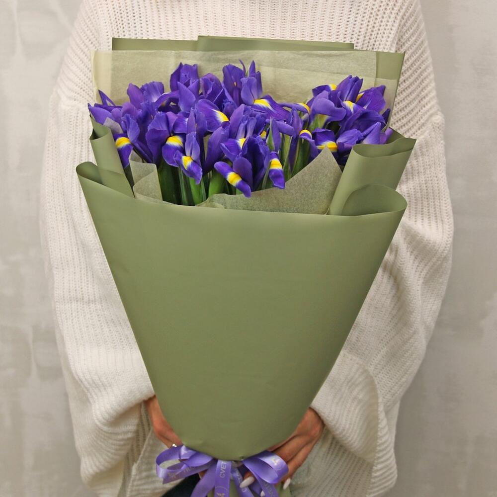 Букет из 25 синих ирисов в стильной упаковке