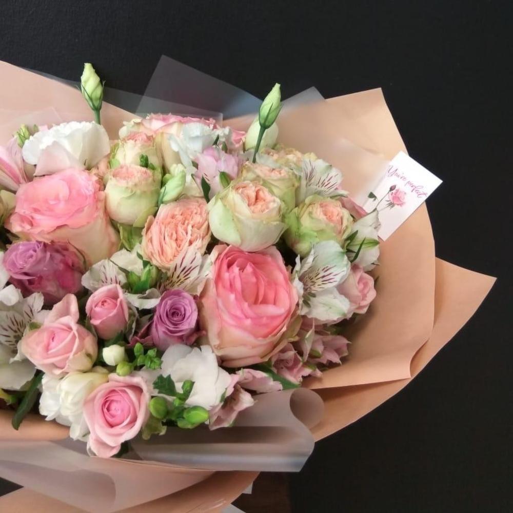 Альстромерия – 2 шт.Лизиантус – 2 шт.Фрезия – 5 шт.Кустовая роза – 5 шт.Атласная лента – 1 шт.Фисташка пучок – 2 шт.Роза одноголовая пионовидная – 2 шт.Карточка для подписи – 1 шт.Роза одноголовая эквадор 50 см – 2 шт.Пленка корейская – 2 шт.Прищепка – 1 шт.роза кения – 5 шт.