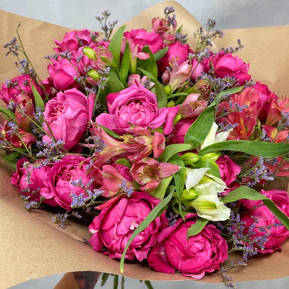 Альстромерия – 8 шт.Лимониум – 2 шт.Роза кустовая пионовидная – 7 шт.