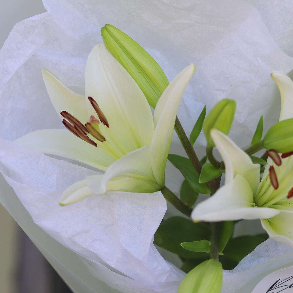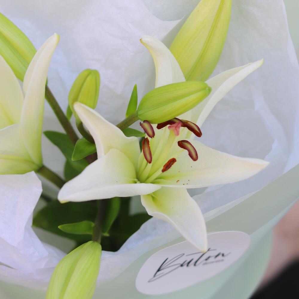 Лилия белая – 2 шт.Дизайнерская упаковка – 1 шт.открыточка с вашими пожеланиям – 1 шт.шоколадка – комплимент для получательницы – 1 шт.