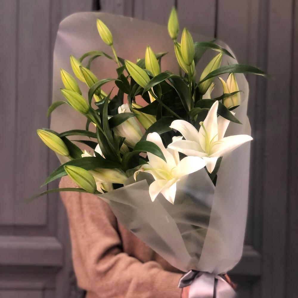 Лилия белая – 5 шт.Упаковка дизайнерская – 2 шт.Лента атласная – 2 шт.