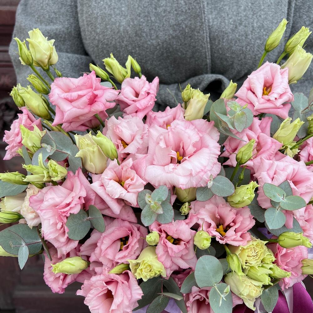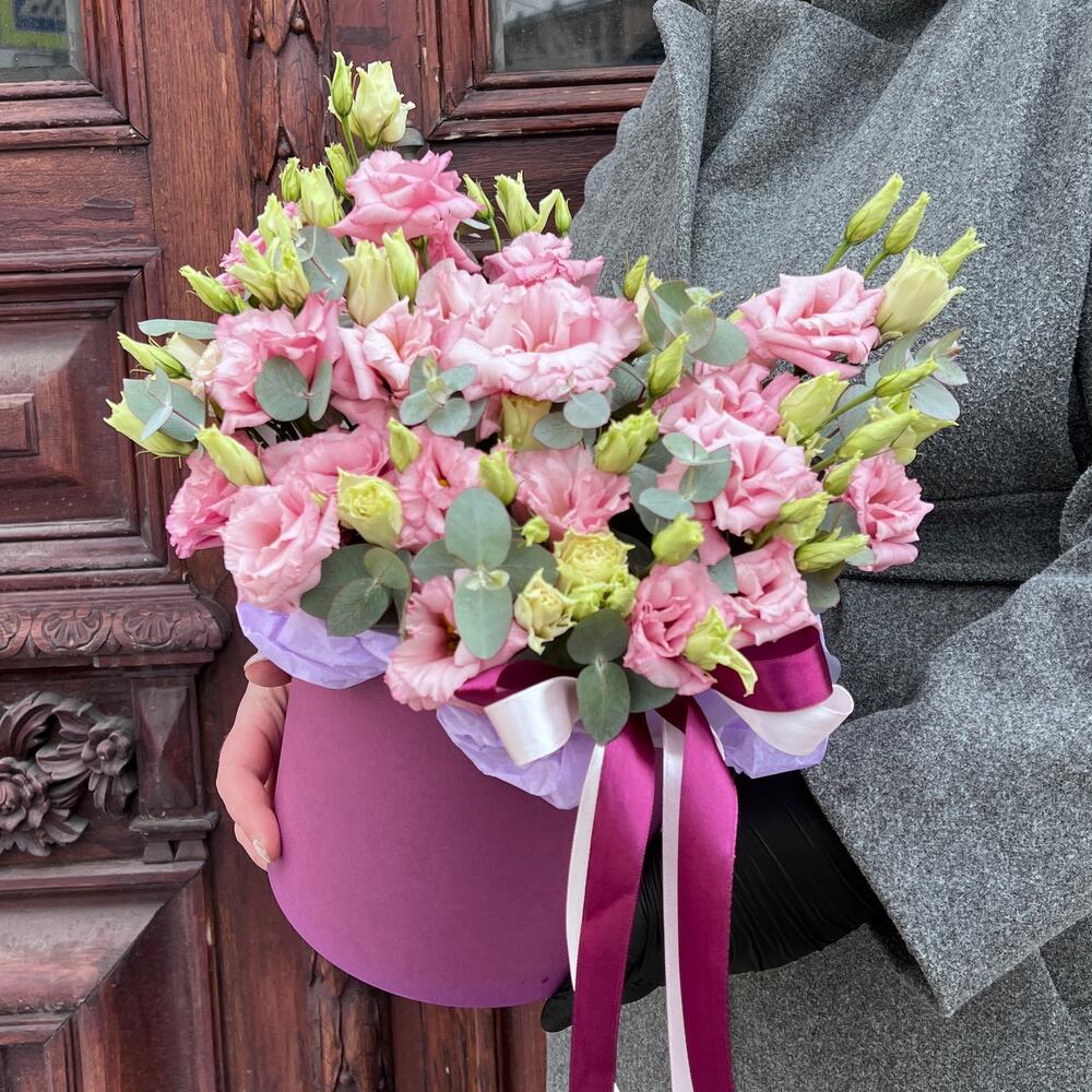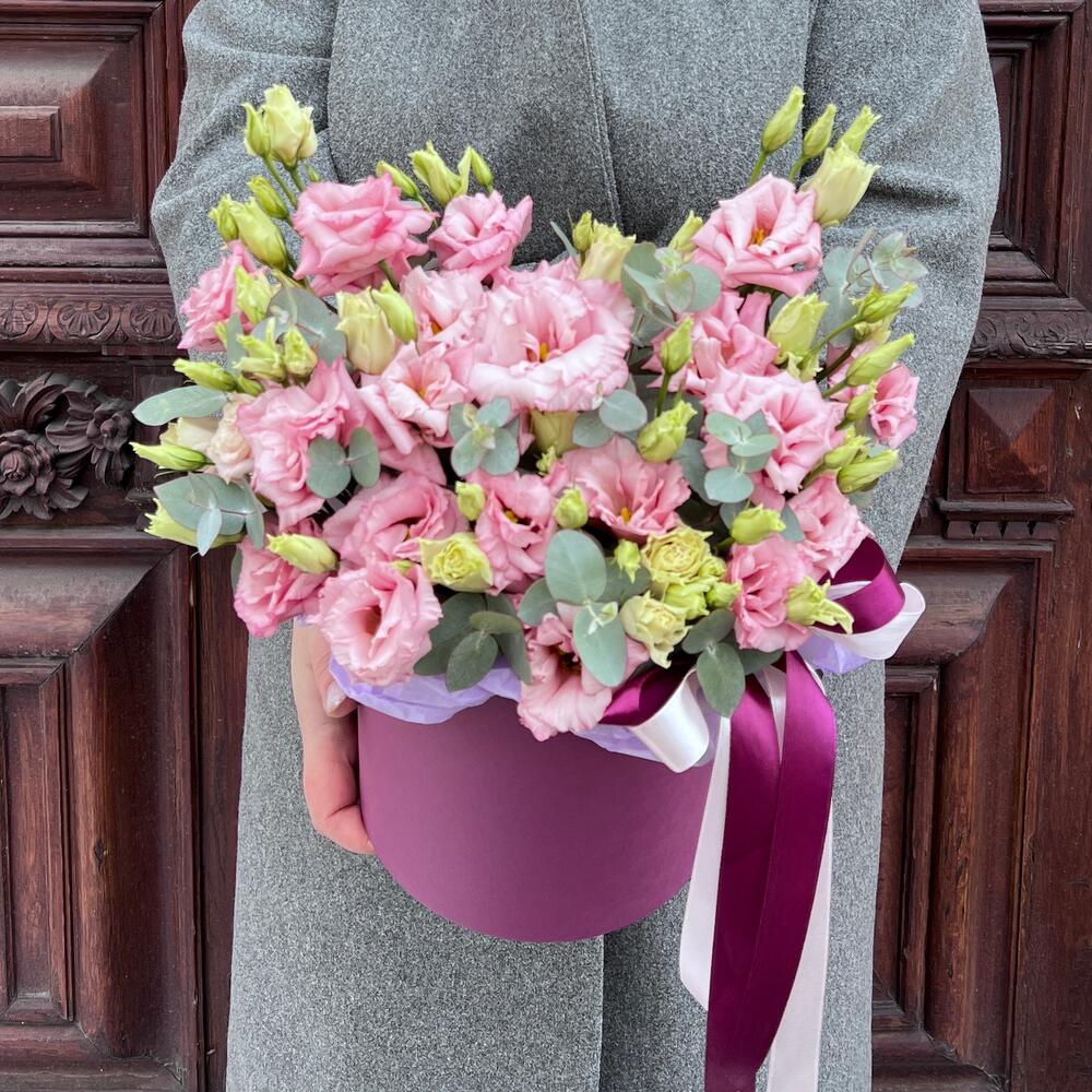 Эвкалипт – 3 шт.Лента атласная – 2 шт.Тишью – 1 шт.Коробка шляпная – 1 шт.Оазис флористический – 1 шт.эустома махровая розовая – 7 шт.