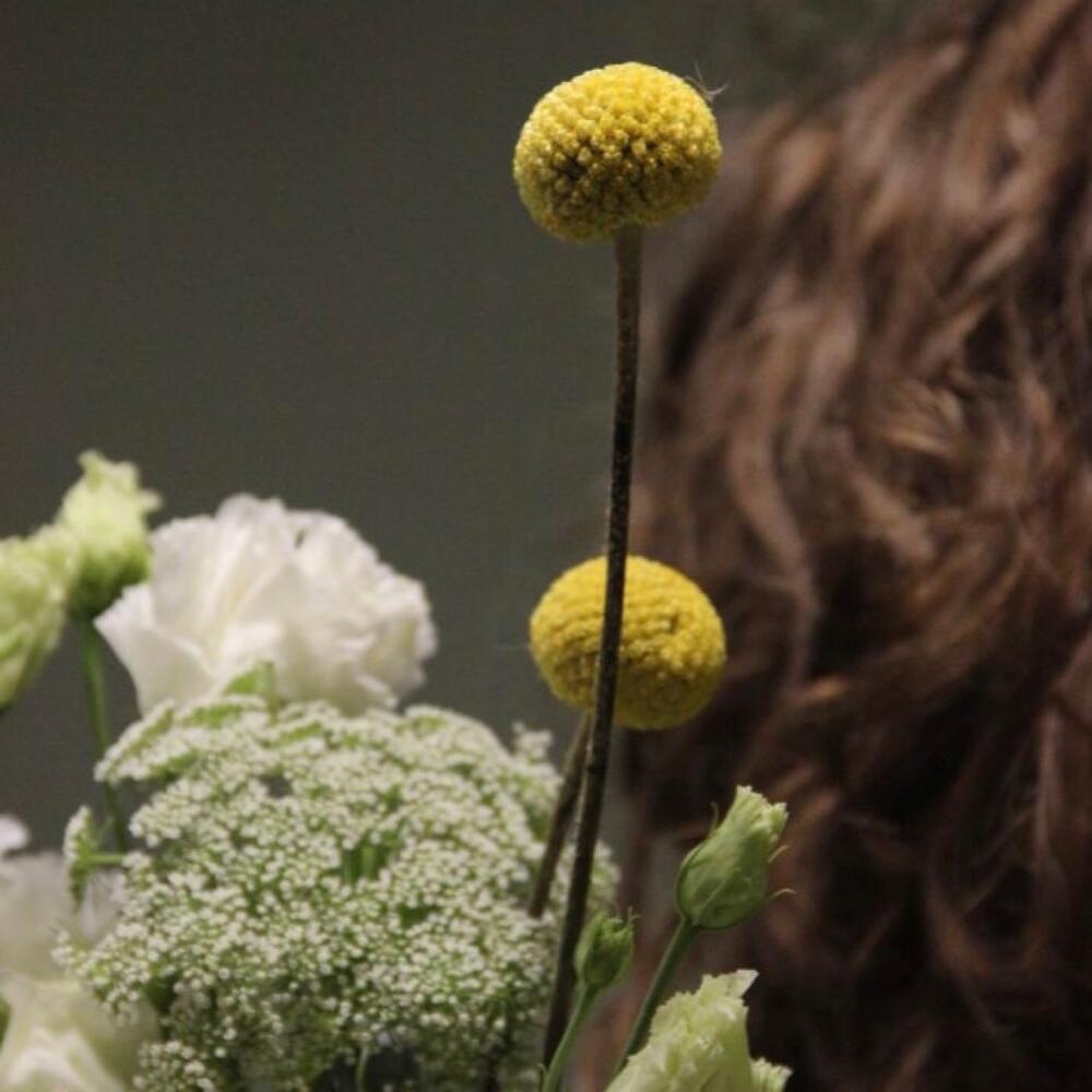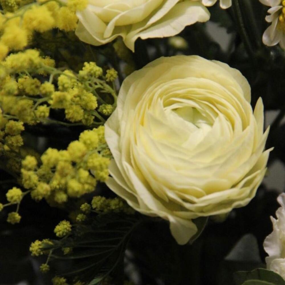 Ромашка кустовая – 2 шт.Мимоза – 1 шт.Краспедия – 3 шт.Ранункулюс – 2 шт.Амми – 2 шт.Лизиантус – 3 шт.Эвкалипт – 5 шт.Лента – 1 шт.