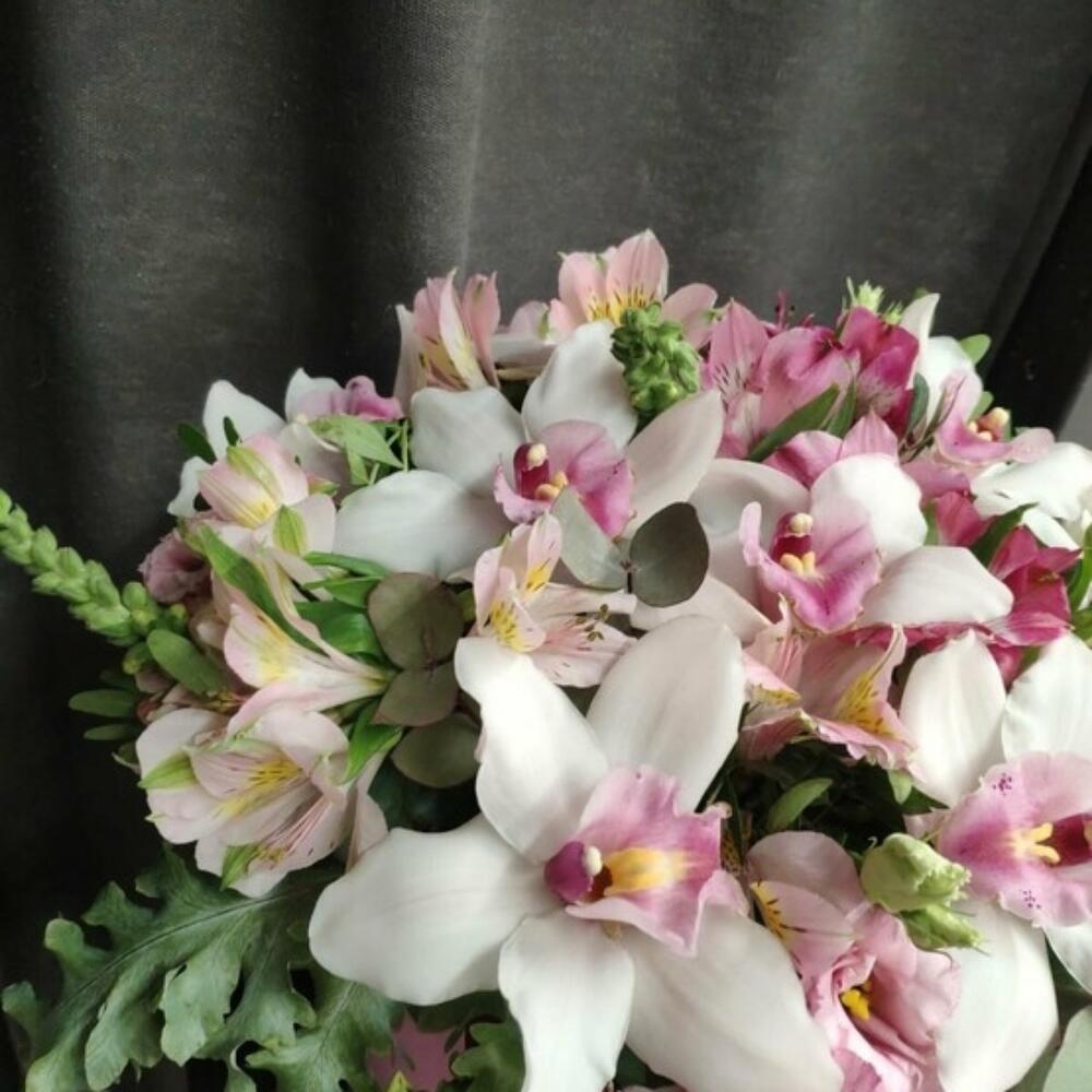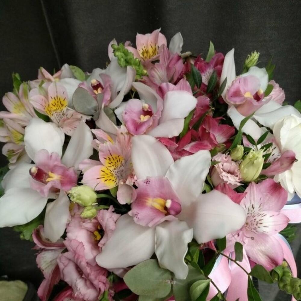 Орхидея Цимбидиум – 7 шт.Альстромерия – 6 шт.Коробка шляпная – 1 шт.Оазис флористический – 1 шт.Эустома – 4 шт.зелень декоративная – 5 шт.
