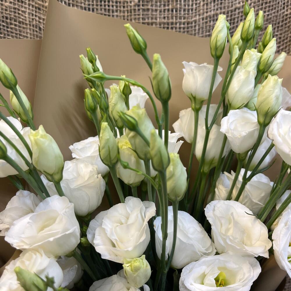 Лента атласная – 2 шт.Лизиантус (эустома) – 5 шт.Упаковка корейская пленка – 1 шт.