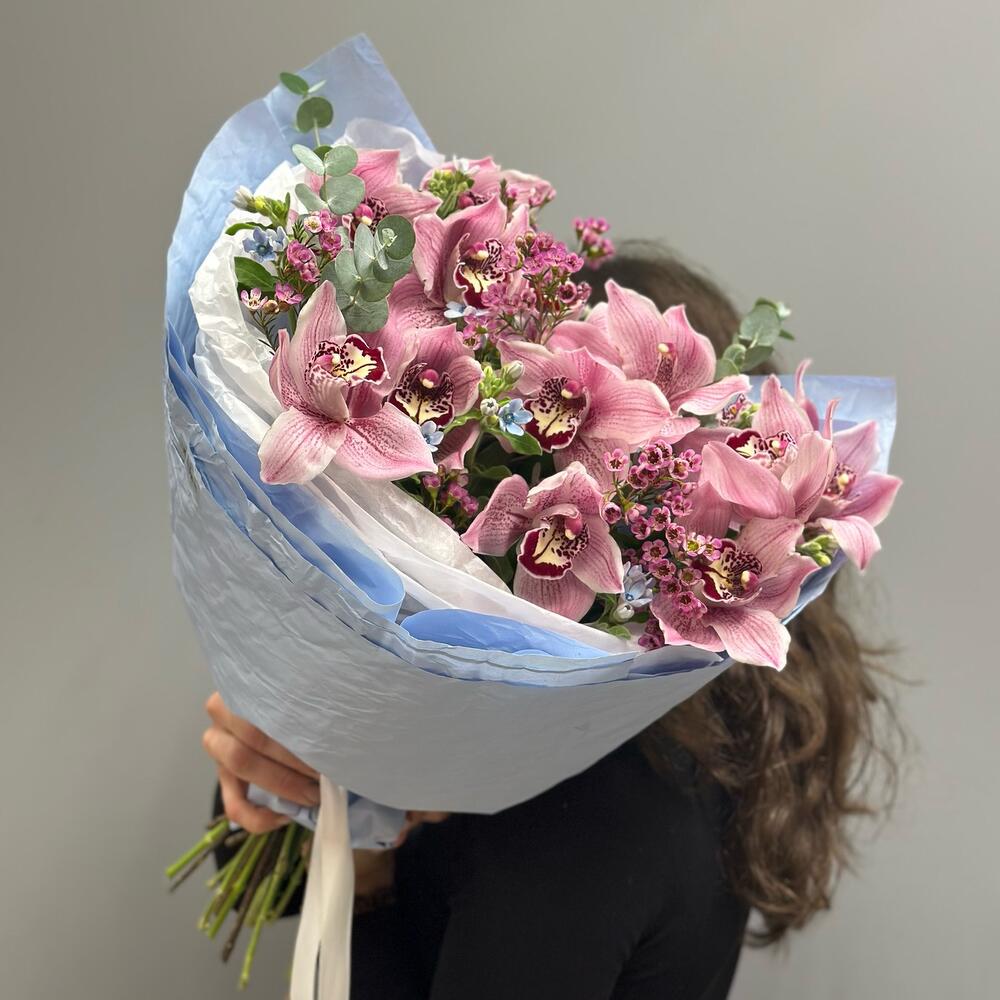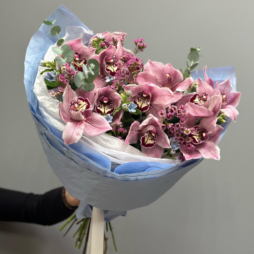 Ваксфлауэр – 2 шт.Эвкалипт – 1 шт.орхидея – 13 шт.Оксипеталум – 9 шт.Упаковка дизайнерская – 1 шт.