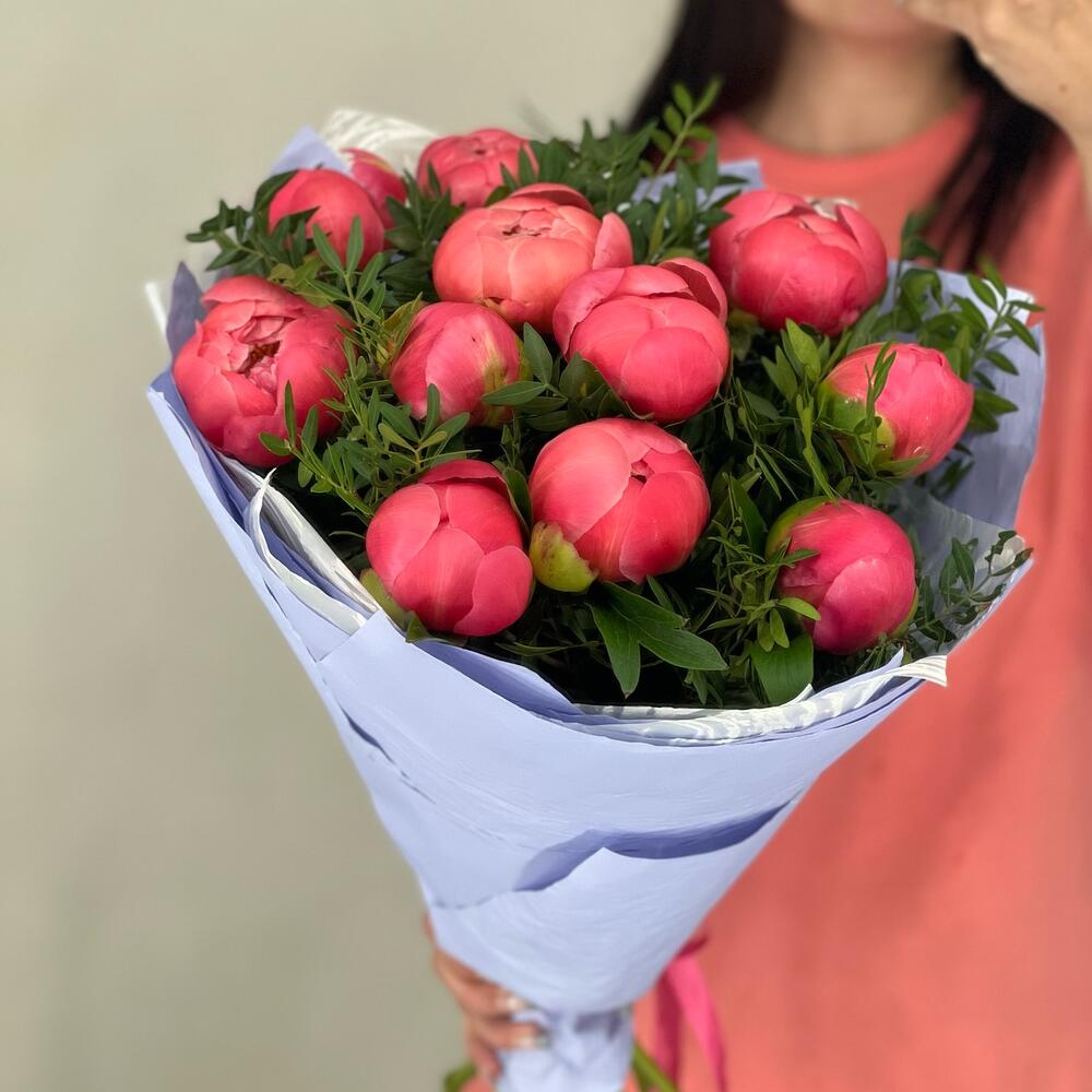 11 коралловых пионов с зеленью