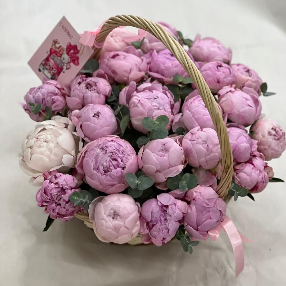 Корзина с оазисом и лентой – 1 шт.Пион розовый – 25 шт.зелень эвкалипт – 5 шт.