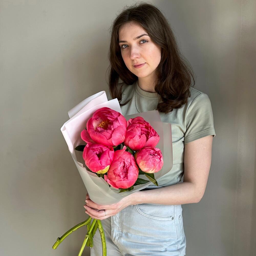 Пион coral sunset – 5 шт.Дизайнерская упаковка – 1 шт.Лента – 1 шт.