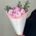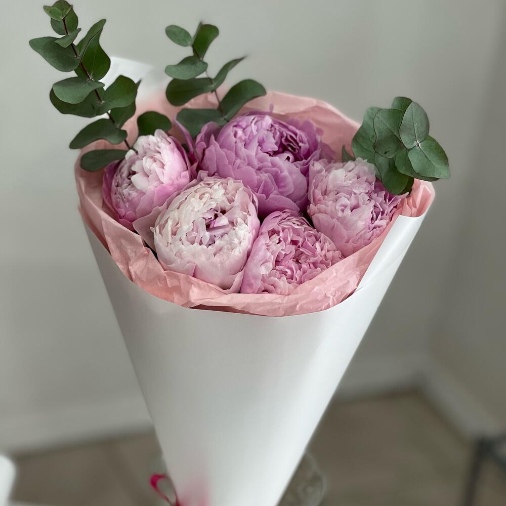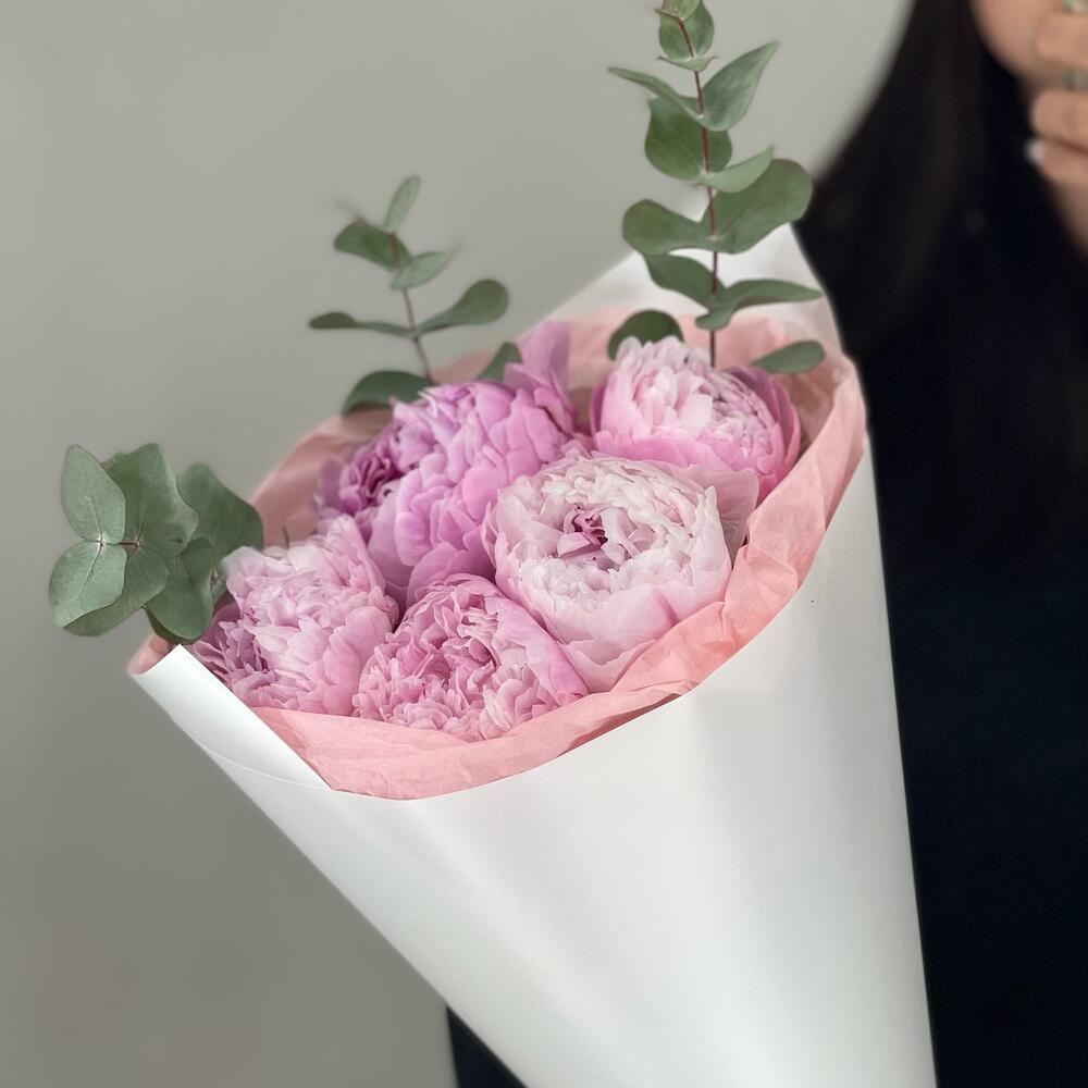 5 розовых пионов с эвкалиптом