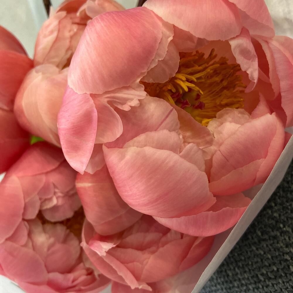 Пион коралл шарм – 5 шт.ветки цветущие – 4 шт.Упаковка дизайнерская – 1 шт.переноска для цветов – 1 шт.